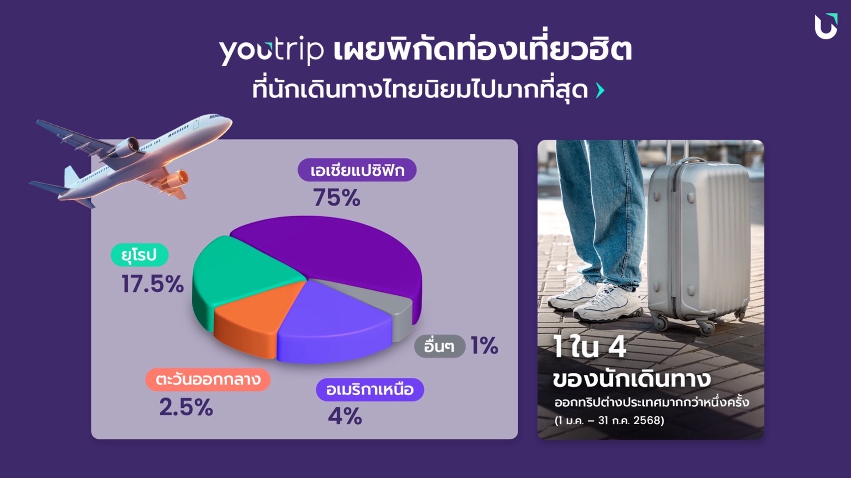 น.ส.จุฑาศรี คูวินิชกุล ผู้ร่วมก่อตั้ง YouTrip ประเทศไทย เผยว่า “ในครึ่งปีแรกของปี 2568 คนไทยเที่ยวต่างประเทศเพิ่มขึ้น 45% เมื่อเทียบกับปีก่อน สะท้อนว่าการเที่ยวต่างประเทศกลายเป็นอีกหนึ่งไลฟ์สไตล์สำคัญ แต่จะเน้นการเที่ยวอย่างชาญฉลาดมากขึ้นตามแนวคิด ‘หั่นเที่ยว ไม่หั่นทริป’ คือเปลี่ยนจุดหมายให้อยู่ในเอเชียแปซิฟิก แต่ยังคุ้มค่าคุ้มประสบการณ์ นอกจากนี้ อีกเทรนด์ที่เห็นได้ชัดคือการเติบโตของ ‘นักเดินทางยุคดิจิทัล’ ที่ใช้ AI เป็นตัวช่วยในการวางแผนทริป และใช้ดิจิทัลวอลเล็ตที่รองรับเงินหลายสกุล (Multi-Currency Wallet) อย่าง YouTrip เพื่อการจ่ายเงินที่คล่องตัวและคุ้มค่าที่สุด