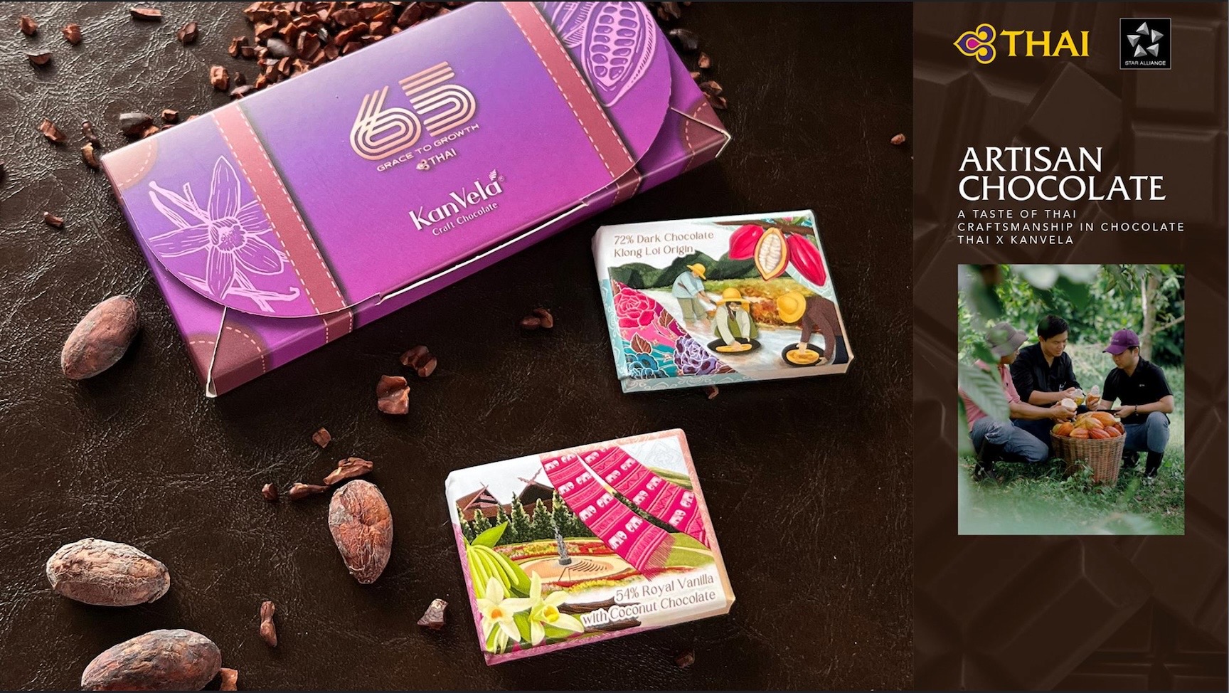 การบินไทย ร่วมกับพันธมิตรชั้นนำเพื่อยกระดับวัตถุดิบจากเมืองไทยสู่น่านฟ้าอย่างต่อเนื่อง ไม่ว่าจะเป็นคราฟต์ช็อกโกแลตที่ปลูกในประเทศไทยจาก “กานเวลา ช็อกโกแลต” กับรสชาติอันเป็นเอกลักษณ์ที่มักผสานเสน่ห์ของขนมไทยและผลไม้ท้องถิ่นเข้ากับช็อกโกแลตพรีเมียม อาทิ ช็อกโกแลตรสถั่วแปบ ที่ให้บริการในชั้น Royal First โดดเด่นด้วยความหอมของถั่วเหลือง มะพร้าว และงาคั่ว ที่เข้ากันอย่างลงตัว ด้าน “ดอยตุง” ก็ได้รังสรรค์กาแฟดริปพรีเมียม Black Silk Blend ที่ผสานกลิ่นดาร์กช็อกโกแลตและคาราเมล ให้รสกลมกล่อม นุ่มนวล สำหรับเสิร์ฟในชั้น Royal First และ Royal Silk นอกจากนี้ ยังมีกาแฟสูตรใหม่อย่าง Royal Highland Single Origin สำหรับให้บริการบนทุกชั้นโดยสารและทุกเที่ยวบินอีกด้วย