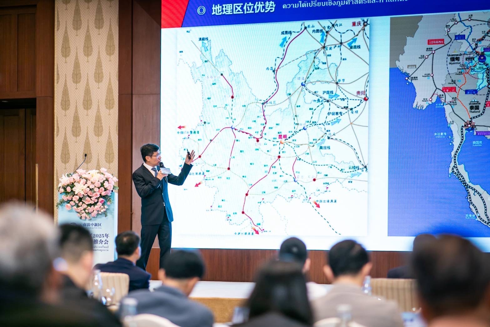 นายหยาง ตงเหว่ย ผู้อำนวยการประจำ เขตพัฒนาใหม่เตียนจง กล่าวว่า เตียนจงเป็นเขตเศรษฐกิจระดับชาติลำดับที่ 15 ของจีน ซึ่งสอดคล้องกับข้อตกลงเขตการค้าเสรีระหว่างประเทศในเอเชียตะวันออก( RCEP) และรองรับการเปิดให้บริการรถไฟจีน-ลาว ทำให้เขตพัฒนาแห่งนี้มีข้อได้เปรียบด้านทำเลที่ตั้งที่โดดเด่น โดยเป็นจุดเชื่อมโยงสำคัญของจีนสู่เอเชียใต้และเอเชียตะวันออกเฉียงใต้ ด้วยตลาดขนาดใหญ่ที่มีประชากรจีนกว่า 1.4 พันล้านคน และตลาดเอเชียใต้-เอเชียตะวันออกเฉียงใต้ที่มีประชากรกว่า 2.4 พันล้านคน ขณะที่เขตพัฒนาใหม่เตียนจงมุ่งเน้นอุตสาหกรรมยาชีวภาพ สารสนเทศอิเล็กทรอนิกส์ วัสดุใหม่ และการบิน รวมถึงส่งเสริมการพัฒนาอุตสาหกรรมเคมี พลังงาน และเครื่องจักรกลในมณฑลยูนนานและนครคุนหมิง อันเป็นไปในทิศทางการพัฒนาอุตสาหกรรมของประเทศไทย ส่งผลให้ทั้งสองฝ่ายมีโอกาสในการเสริมสร้างความร่วมมือในห่วงโซ่การผลิตและห่วงโซ่อุปทานอย่างมาก ดังนั้นการจัดประชุมส่งเสริมการลงทุนครั้งนี้มีขึ้นเพื่อสนับสนุนศักยภาพความร่วมมือด้านอุตสาหกรรมระหว่างจีนและไทย และขับเคลื่อนผลประโยชน์ร่วมกันในหลากหลายมิติและระดับที่ลึกซึ้งยิ่งขึ้น