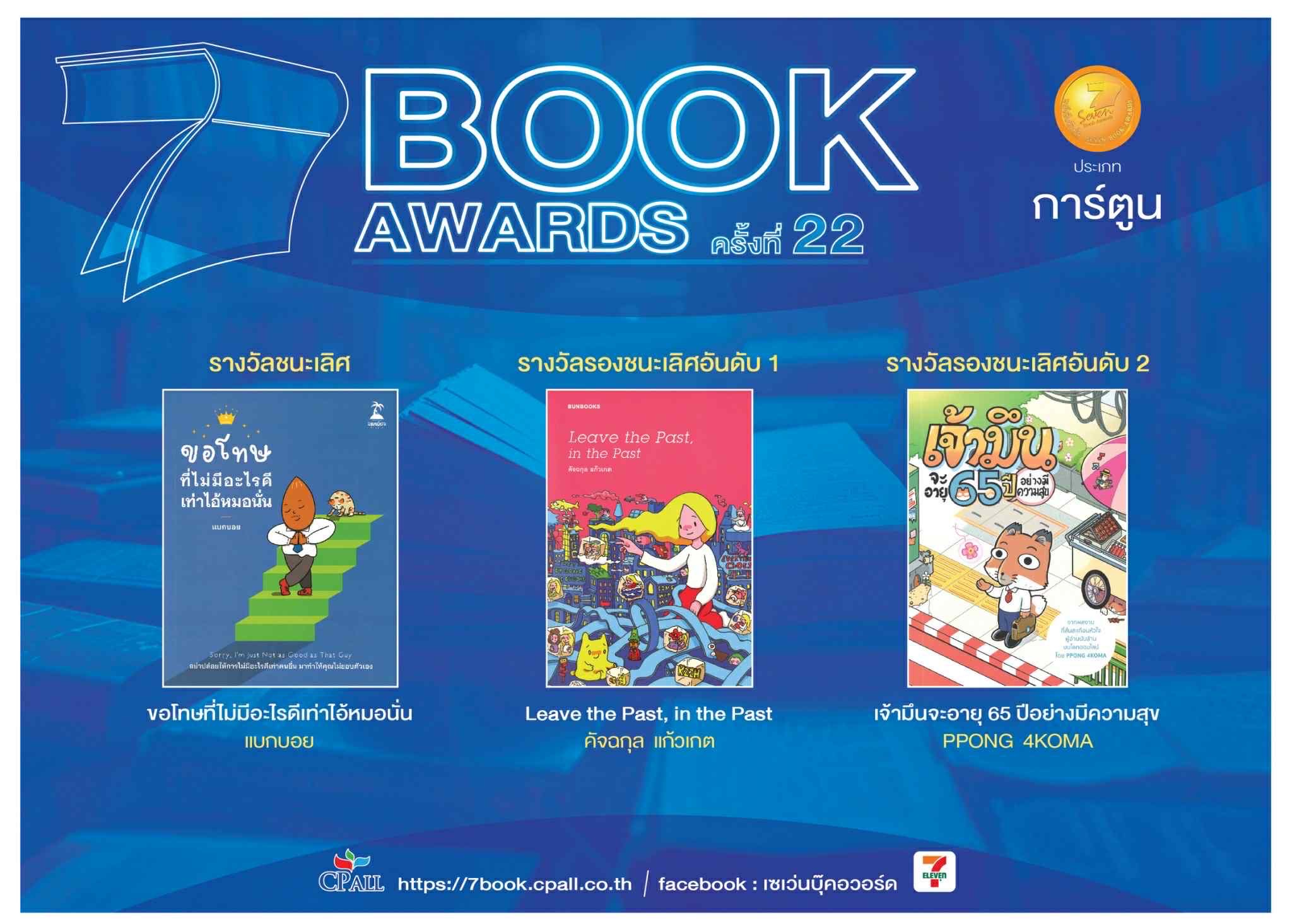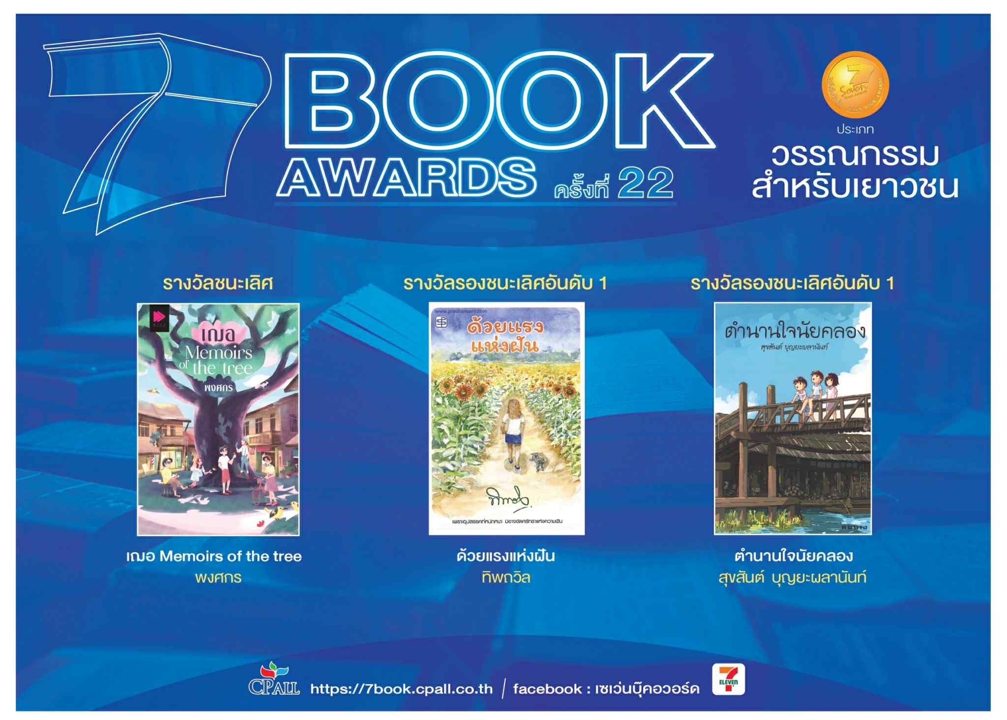 ซีพี ออลล์ ประกาศผลรางวัลเซเว่นบุ๊คอวอร์ด ครั้งที่ 22 ได้ผลงานชนะเลิศครบ 6 ประเภทหลัก “คือชีวิต ผู้คน และการเดินทาง Life People and Travel” ของ “แม่น้ำ เรลลี่” ชนะเลิศกวีนิพนธ์ “ขอโทษที่ไม่มีอะไรดีเท่าไอ้หมอนั่น” ของ “แบกบอย” ชนะเลิศการ์ตูน “ล้านนาฮาเร็ม” ของ “สาคร พูลสุข” ชนะเลิศนวนิยาย “ทีโพโกล” ของ “วุฒิเดช มนต์ชัยวิศาล” ชนะเลิศรวมเรื่องสั้น ขณะที่ “เฌอ Memoirs of the tree” ของ “พงศกร” ชนะเลิศวรรณกรรมสำหรับเยาวชน ด้าน “Siamese Cat สยามวิฬาร์ & ประวัติศาสตร์ไทยฉบับเเมวเหมียว” ของ “กำพล จำปาพันธ์” ชนะเลิศสารคดี