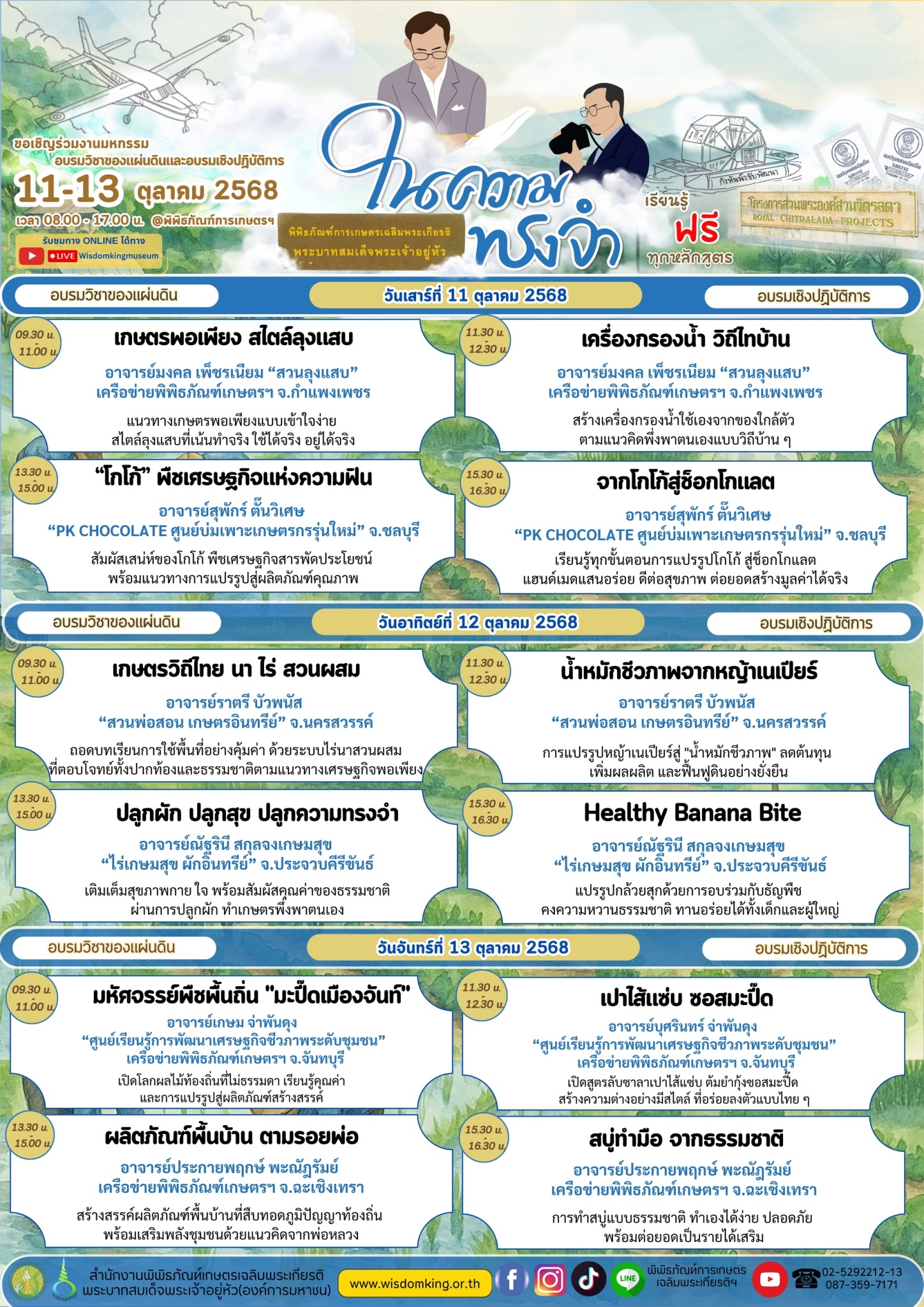 รวมถึงนิทรรศการพิเศษ“ในความทรงจำ” จากหน่วยงานในสังกัดกระทรวงเกษตรและสหกรณ์และหน่วยงานภาคีความร่วมมือ กว่า 12 หน่วยงาน ที่ผนึกกำลังมาร่วมกันถ่ายทอดองค์ความรู้ให้กับประชาชนที่มาร่วมงานเรียนรู้หลักปรัชญาของเศรษฐกิจพอเพียง ด้านการเกษตร กับวิทยากรมากประสบการณ์และเกษตรกรตัวจริงเสียงจริง ที่นำองค์ความรู้มาถ่ายทอดให้ผู้ที่เข้าร่วมวิชาของแผ่นดินและ Workshop ได้เรียนรู้เพื่อนำไปปรับใช้กับการดำเนินชีวิตกว่า 12 หลักสูตร โดยไม่เสียค่าใช้จ่าย