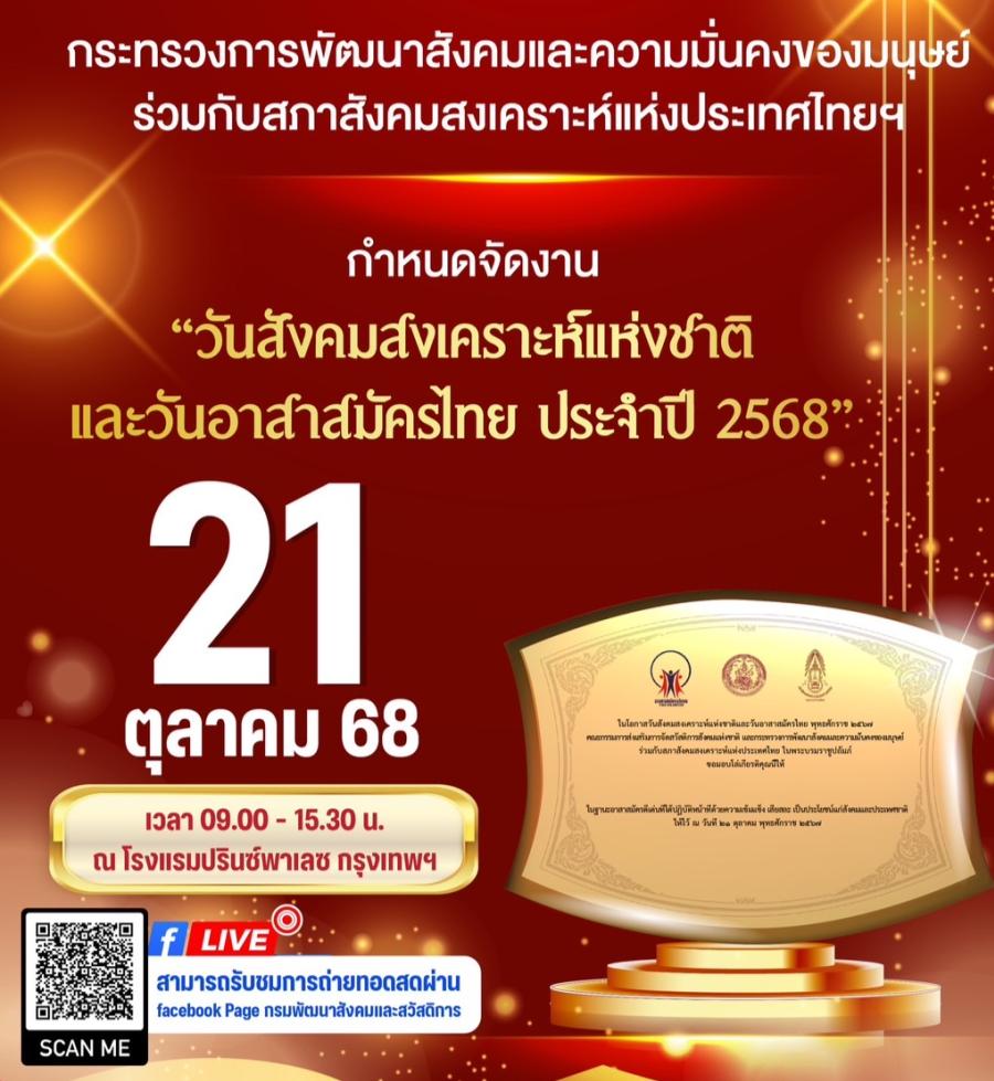 กรมพัฒนาสังคมและสวัสดิการ โดยสำนักงานคณะกรรมการส่งเสริมการจัดสวัสดิการสังคมแห่งชาติ ร่วมกับสภาสังคมสงเคราะห์แห่งประเทศไทยในพระบรมราชูปถัมภ์ จึงได้กำหนดจัดงาน “วันสังคมสงเคราะห์แห่งชาติและวันอาสาสมัครไทย ประจำปี 2568” เพื่อเป็นการเผยแพร่พระเกียรติคุณและพระราชกรณียกิจของสมเด็จพระศรีนครินทราบรมราชชนนี ตลอดจนให้ความสำคัญกับการขับเคลื่อนการทำงานด้านการจัดสวัสดิการสังคม สังคมสงเคราะห์