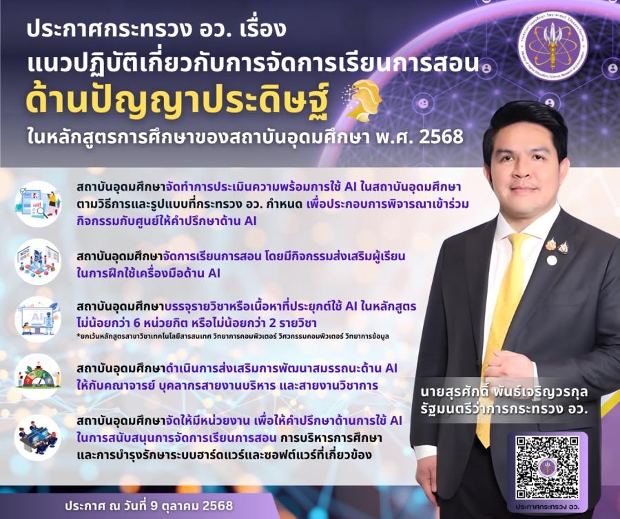 เมื่อวันที่ 16 ต.ค. นายสุรศักดิ์ พันธุ์เจริญวรกุล รมว.การอุดมศึกษา วิทยาศาสตร์ วิจัยและนวัตกรรม (อว.) เปิดเผยว่า ตนได้ลงนามในประกาศกระทรวง อว. เรื่อง “แนวปฏิบัติเกี่ยวกับการจัดการเรียนการสอนด้านปัญญาประดิษฐ์ (AI) ในหลักสูตรการศึกษาของสถาบันอุดมศึกษา พ.ศ. 2568” เพื่อยกระดับการศึกษารองรับตลาดแรงงานและสังคมเทคโนโลยีที่เปลี่ยนแปลงรวดเร็ว เป้าหมายคือสร้างบัณฑิตที่มีทักษะพร้อมใช้ AI เป็น ควบคู่ไปกับการพัฒนาระบบนิเวศการศึกษาไทยให้ทันสมัย