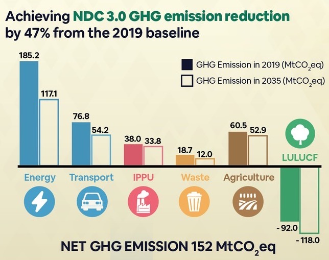 นายสุชาติ ชมกลิ่น รองนายกรัฐมนตรีและรัฐมนตรีว่าการกระทรวงทรัพยากรธรรมชาติและสิ่งแวดล้อม (รมว.ทส.) เปิดเผยว่า คณะรัฐมนตรี (ครม.) เมื่อวันที่ 4 พ.ย. มีมติเห็นชอบต่อร่างเป้าหมายการมีส่วนร่วมที่ประเทศกำหนด ฉบับที่ 2 (NDC 3.0) ซึ่งเป็นก้าวสำคัญในการเร่งเป้าหมาย Net Zero ให้เร็วขึ้น 15 ปี เพื่อให้สอดคล้องกับ 1.5 ºC Pathway ตามนโยบายของรัฐบาลข้อ 13 การผลักดันสังคมคาร์บอนต่ำ ที่นายกรัฐมนตรีอนุทิน ชาญวีรกูล แถลงต่อรัฐสภา โดยมุ่งลดการปล่อยก๊าซเรือนกระจกในทุกภาคส่วนของเศรษฐกิจ (Economy-wide) ณ ปี ค.ศ. 2035 (พ.ศ. 2578) และเร่งเพิ่มเป้าหมายการดูดกลับก๊าซเรือนกระจกในภาคป่าไม้และการใช้ประโยชน์ที่ดิน (LULUCF) ซึ่งจะทำให้ประเทศไทยมีระดับการปล่อยก๊าซเรือนกระจกสุทธิ 152 MtCO2eq หรือลดลงร้อยละ 47 จากระดับการปล่อยก๊าซเรือนกระจกในปี ค.ศ. 2019 รวมถึงได้จัดทำแผนการลงทุนเพื่อดึงเม็ดเงินจากต่างประเทศ 230000 ล้านบาท ในการสนับสนุนไทยลดก๊าซเรือนกระจก 32.8 MtCO2eq ตามเงื่อนไขของความตกลงปารีส