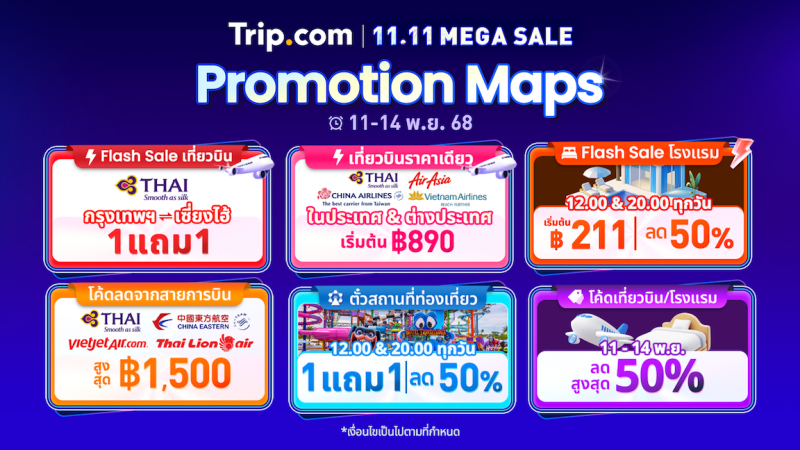 Trip.com ผู้นำด้านบริการการท่องเที่ยวระดับโลก เดินหน้ามอบความคุ้มค่าครั้งยิ่งใหญ่กับโปรโมชั่นประจำปี 11.11 Mega Sale ระหว่างวันที่ 11 - 14 พ.ย. รวบรวมดีลท่องเที่ยวสุดพิเศษครบทุกประเภท ทั้งตั๋วเครื่องบิน โรงแรม รถเช่า และตั๋วเข้าสถานที่ท่องเที่ยว
