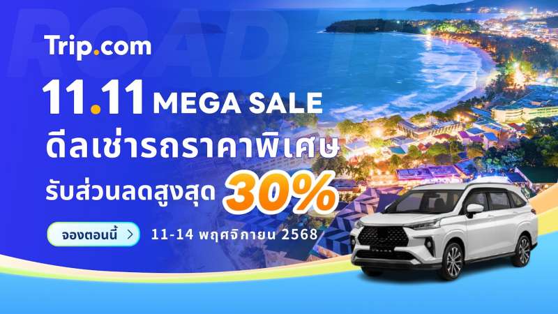 โปรโมชั่น 11.11 Mega Sale มอบโซลูชั่นการเดินทางที่ครบครัน และคุ้มค่ามากขึ้นผ่านดีลเช่ารถราคาพิเศษสำหรับการเช่ารถในจุดหมายปลายทางยอดนิยมทั่วโลก ซึ่งไฮไลท์คือโค้ดส่วนลดในการเช่ารถ 50%* ที่ใช้ได้ในหลายภูมิภาค จุดหมายสำคัญในเอเชีย รวมถึง เกาหลีใต้ ฮ่องกง ไทย ญี่ปุ่น ไต้หวัน สิงคโปร์ และมาเลเซีย เปิดให้ใช้โค้ดส่วนลดทุกวันตลอด 11-14 พ.ย.นี้ นอกจากนี้ยังมีดีลเช่ารถลดราคาพิเศษ มอบส่วนลดสูงสุด 30%* ในจุดหมายการเดินทางยอดนิยมต่างๆ เพื่อให้ครอบคลุมความต้องการการเดินทางที่หลากหลาย ผู้ที่สนใจสามารถจองบริการเช่ารถได้ที่ https://th.trip.com/carhire/
