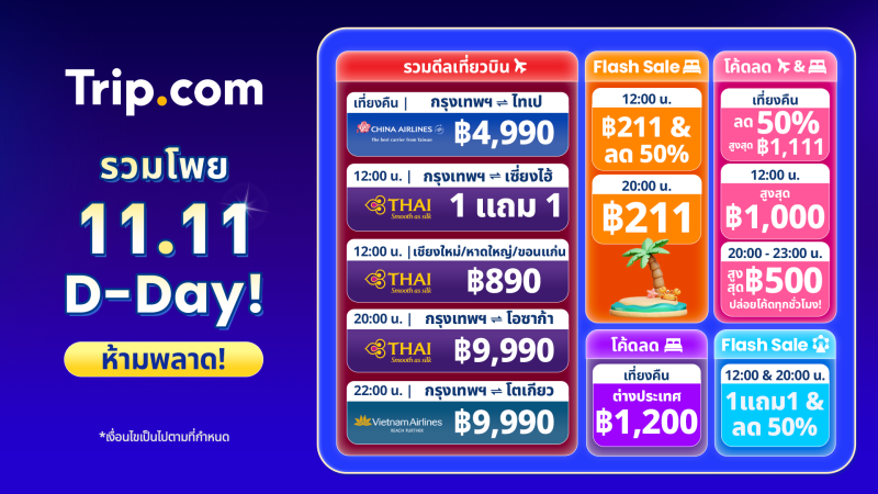 โปรฯ 11.11 Trip.com ดีลท่องเที่ยวครบจบในที่เดียว ตั๋วเครื่องบินซื้อ 1 แถม 1 โรงแรมคืนละ 211 บาท โปรฯเช่ารถและตั๋วท่องเที่ยวลด 50%