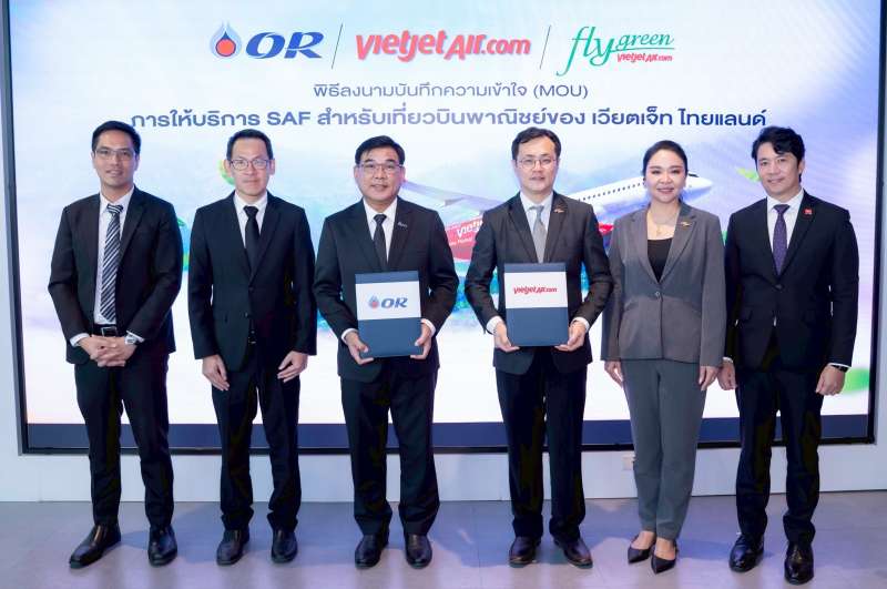 นายพิชิต เจียรกิตติมศักดิ์ ประธานเจ้าหน้าที่ฝ่ายการเงิน สายการบินเวียตเจ็ทไทยแลนด์ พร้อมด้วย นายไพศาล อุดมกุลวณิชย์ รองประธานเจ้าหน้าที่บริหารด้านธุรกิจเอนเนอร์ยี่โซลูชัน OR ร่วมลงนามบันทึกความเข้าใจ (MOU) ว่าด้วยความร่วมมือด้านน้ำมันอากาศยานแบบยั่งยืน (Sustainable Aviation Fuel: SAF) สำหรับความร่วมมือครั้งนี้นับเป็นการสานต่อความสำเร็จจากปี 2567 ที่ผ่านมา ซึ่งทั้งสององค์กรได้ร่วมกันศึกษาความเป็นไปได้ของการใช้น้ำมันเชื้อเพลิง SAF และดำเนินการทดลองเที่ยวบินเชิงพาณิชย์ครั้งแรกของเวียตเจ็ทไทยแลนด์ในเส้นทาง “กรุงเทพฯ–ดานัง” เมื่อวันที่ 11 ก.ค. ที่ท่าอากาศยานนานาชาติสุวรรณภูมิ โดยมี OR เป็นผู้ส่งน้ำมัน SAF สำหรับใช้ในเที่ยวบินดังกล่าว นับเป็นจุดเริ่มต้นสำคัญของการขับเคลื่อนการบินสีเขียว หรือ Fly Green ของประเทศไทยอย่างเป็นรูปธรรม