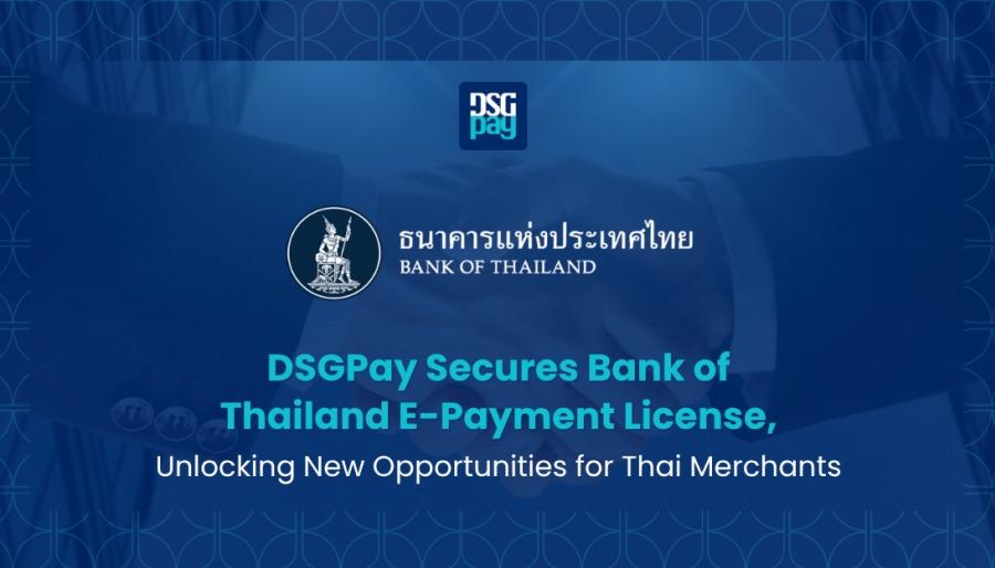 DSGPay บริษัทฟินเทคระดับโลกที่เชี่ยวชาญด้านการชำระเงินและรับชำระเงินระหว่างประเทศ Multi-Currency Virtual Accounts และบริการแลกเปลี่ยนเงินตราต่างประเทศ (Foreign Exchange) ได้รับอนุมัติใบอนุญาตประกอบธุรกิจบริการรับชำระเงินทางอิเล็กทรอนิกส์ (E-Payment License) จาก ธนาคารแห่งประเทศไทย (ธปท.) อย่างเป็นทางการ