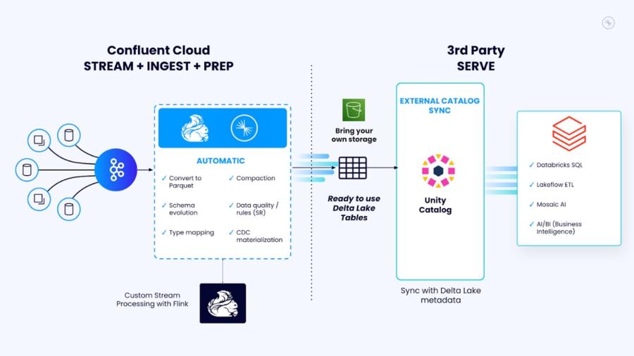 • รวมศูนย์การกำกับดูแลข้อมูล: การรองรับ Unity Catalog (GA) จะทำให้การเชื่อมต่อเมตาดาต้า (Metadata) สคีมา (Schema) และนโยบายการเข้าถึงข้อมูลระหว่าง Tableflow และ Databricks Unity Catalog เกิดขึ้นได้โดยอัตโนมัติ เพื่อให้การกำกับดูแลและการจัดการข้อมูลเป็นไปในทิศทางเดียวกัน และสอดคล้องกันทั่วทั้งองค์กร