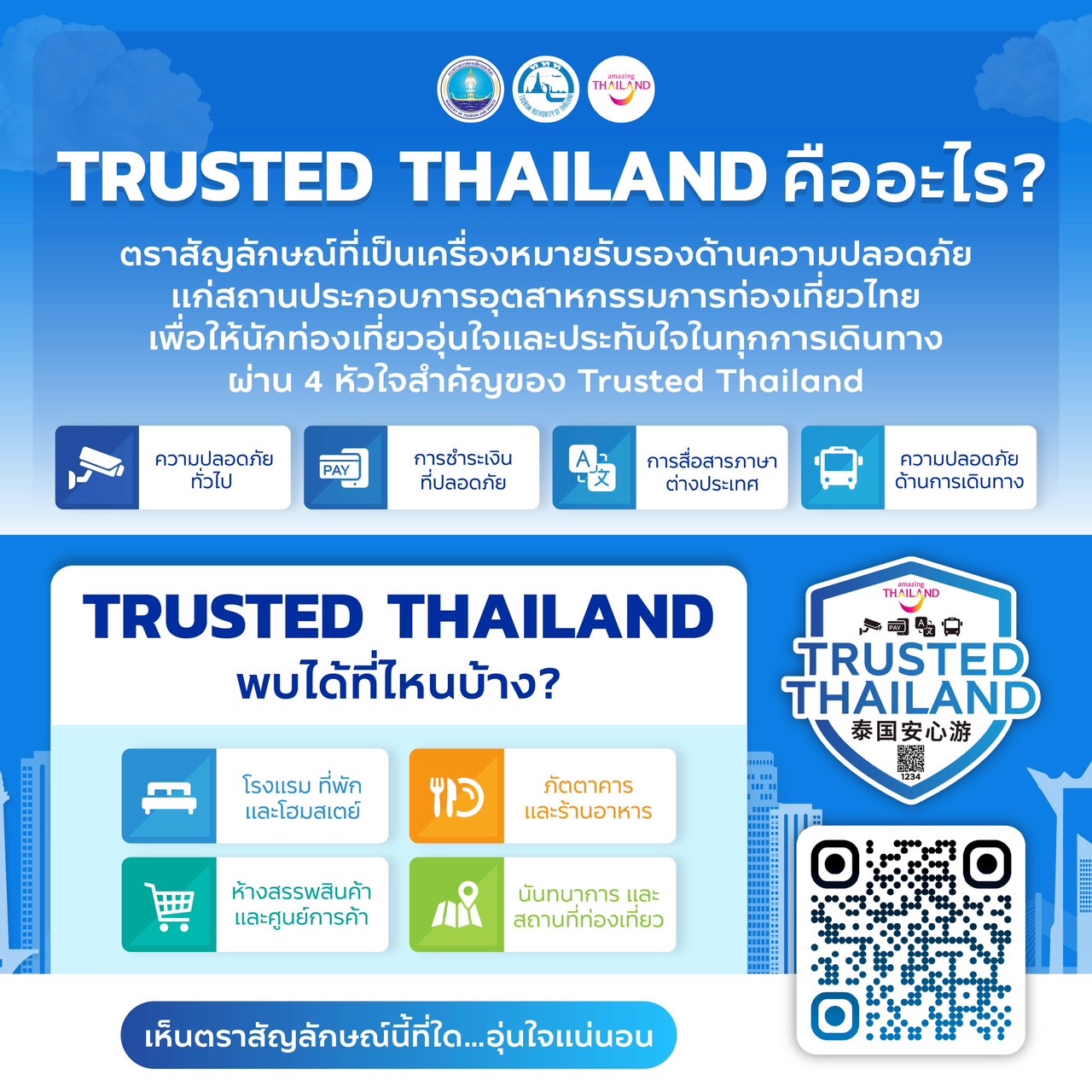 กระทรวงการท่องเที่ยวและกีฬา โดยการท่องเที่ยวแห่งประเทศไทย (ททท.) ได้เปิดตัวตราสัญลักษณ์ Trusted Thailand อย่างเป็นทางการ ซึ่งเป็นเครื่องหมายที่จะสร้างความเชื่อมั่นในการท่องเที่ยวสำหรับนักท่องเที่ยวที่เดินทางเข้ามาในประเทศไทย โดยเฉพาะนักท่องเที่ยวชาวจีน ผ่านการตรวจสอบและประเมินแนวทางการดำเนินงานด้านความปลอดภัยของสถานประกอบการ ได้แก่ 1) การรักษาความปลอดภัยทั่วไปสำหรับนักท่องเที่ยว อาทิ การมี CCTV การป้องกันด้านอัคคีภัย