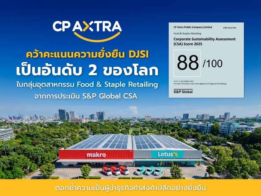 บริษัท ซีพี แอ็กซ์ตร้า จำกัด (มหาชน) หรือ CP AXTRA ผู้ดำเนินธุรกิจค้าส่งค้าปลีก “แม็คโคร–โลตัส” สร้างผลงานโดดเด่นด้านความยั่งยืนระดับโลก จากการประเมิน Corporate Sustainability Assessment (CSA) โดย S&P Global องค์กรผู้จัดทำดัชนี Dow Jones Sustainability Indices (DJSI) ด้วยคะแนนรวม 88 จาก 100 คะแนน ในปี 2025 ซึ่งเพิ่มขึ้นอย่างต่อเนื่องจากปี 2023 และ 2024 ส่งผลให้บริษัทขยับขึ้นสู่อันดับ 2 ของโลกในกลุ่มอุตสาหกรรม Food & Staples Retailing