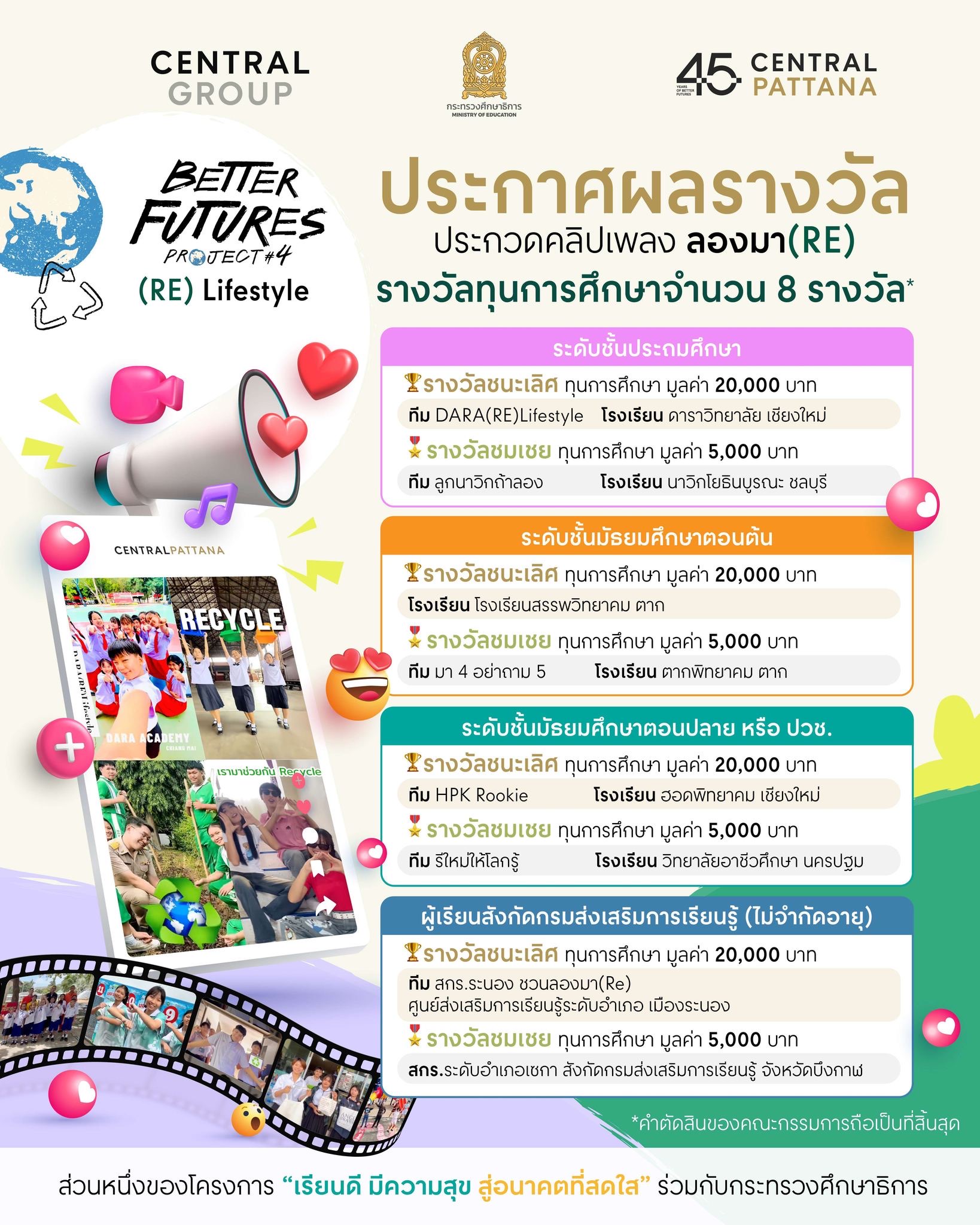 เนื่องในวันเด็กแห่งชาติ เซ็นทรัลพัฒนา ประกาศความสำเร็จจากความร่วมมือภายใต้บันทึกข้อตกลงความร่วมมือการส่งเสริมศักยภาพนักเรียน นักศึกษาระหว่างกระทรวงศึกษาธิการ บริษัท เซ็นทรัลพัฒนา จำกัด (มหาชน) และกลุ่มบริษัทเซ็นทรัล เพื่อตอบสนองนโยบาย “เรียนดี มีความสุข” สร้างระบบนิเวศทางการศึกษา ผ่านความร่วมมือระหว่างกระทรวง ครูผู้สอน บุคลากรทางการศึกษา ผู้ปกครอง ชุมชน และผู้ประกอบการ อีกทั้งเปิดโอกาสให้นักเรียนได้เรียนรู้ ผ่านการลงมือทำจริง ตามแนวทางการขับเคลื่อนเพื่อความยั่งยืน- เซ็นทรัล ทำ ของกลุ่มเซ็นทรัล จัดพิธีมอบประกาศนียบัตรและทุนการศึกษาใน “คลิปสั้นประกอบเพลง ‘ลองมา(RE)’ ภายใต้โครงการ “เรียนดี มีความสุข สู่อนาคตที่สดใส” ระหว่างกระทรวงศึกษาฯและเซ็นทรัลพัฒนา รวม 8 รางวัล และ 2 รางวัลพิเศษ จากผลงานของนักเรียนกว่า 120 ทีมทุกภูมิภาค ที่ ศูนย์การค้าเซ็นทรัล ทั่วประเทศ
