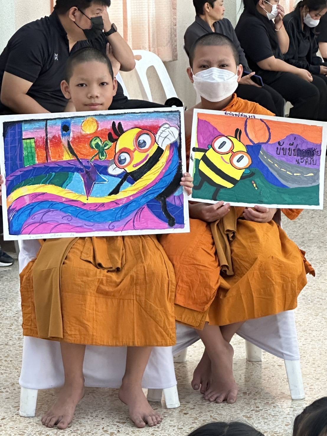 ภายในกิจกรรม เด็กนักเรียนตั้งแต่ระดับชั้นอนุบาล 1 ถึงประถมศึกษาปีที่ 6 จำนวน 74 คน ร่วมกันนำเสนอผลงานวาดภาพระบายสี พร้อมข้อความสะกิดใจในประเด็นสำคัญ อาทิ การสวมหมวกกันน็อก การข้ามทางม้าลาย และการลดความเร็วในการใช้รถใช้ถนน โดยมีมาสคอต “ผึ้งน้อยเป็นหูเป็นตา” สร้างบรรยากาศการเรียนรู้ที่สนุก เป็นกันเอง และเข้าถึงเด็กทุกวัย อีกทั้งย้ำเตือนเรื่องความปลอดภัยให้จดจำได้ง่าย และนำไปใช้ได้จริงในชีวิตประจำวัน ผ่านกิจกรรมร้องเพลง “ผึ้งน้อยระวังหมดอายุ” ซึ่งสื่อสารสาระสำคัญเรื่อง “4 ระวัง” ได้แก่ ระวังทางแยก ระวังทางข้าม ระวังน็อก และระวังความเร็ว