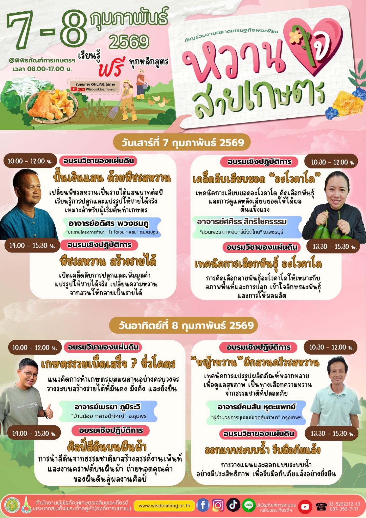 องค์ความรู้ตั้งแต่การปลูกพืชเศรษฐกิจ การเลือกพันธุ์พืช การเพิ่มมูลค่าพืชรสหวาน การแปรรูปผลผลิตไปจนถึงการต่อยอดสู่ผลิตภัณฑ์และอาชีพจริง อาทิ วิชาปั้นเงินแสนด้วยพืชรสหวาน เทคนิคการเลือกพันธุ์ อะโวคาโด เกษตรรวยแบบเสร็จ 7 ชั่วโมง และศิลปะปั้นดินบนผืนผ้า เป็นต้น