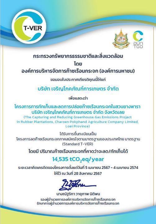 นายเกรียงไกร วัฒนาสว่าง กรรมการผู้จัดการ บริษัท เจริญโภคภัณฑ์การเกษตร จำกัด ธุรกิจพืชครบวงจรข้างขนส่งและบริการ เครือเจริญโภคภัณฑ์ เปิดเผย ภายหลังจากการที่ คณะกรรมการฯ องค์การบริหารจัดการก๊าซเรือนกระจก (องค์การมหาชน) หรือ อบก. มีมติเห็นชอบให้ขึ้นทะเบียน “โครงการกักเก็บและลดการปล่อยก๊าซเรือนกระจกในสวนยางพารา บริษัท เจริญโภคภัณฑ์การเกษตร จำกัด จ.อุทัยธานี และจังหวัดนครพนม (The Capturing and Reducing Greenhouse Gas Emissions Project in Rubber Plantations Charoen Pokphand Agriculture Company Limited Uthai thani and Nakhonphanom Province.)” ตามมาตรฐานของประเทศไทย (Standard T-VER) ประเภทการลด ดูดซับ และการกักเก็บก๊าซเรือนกระจกจากภาคป่าไม้และการเกษตร (FOR&AGI)