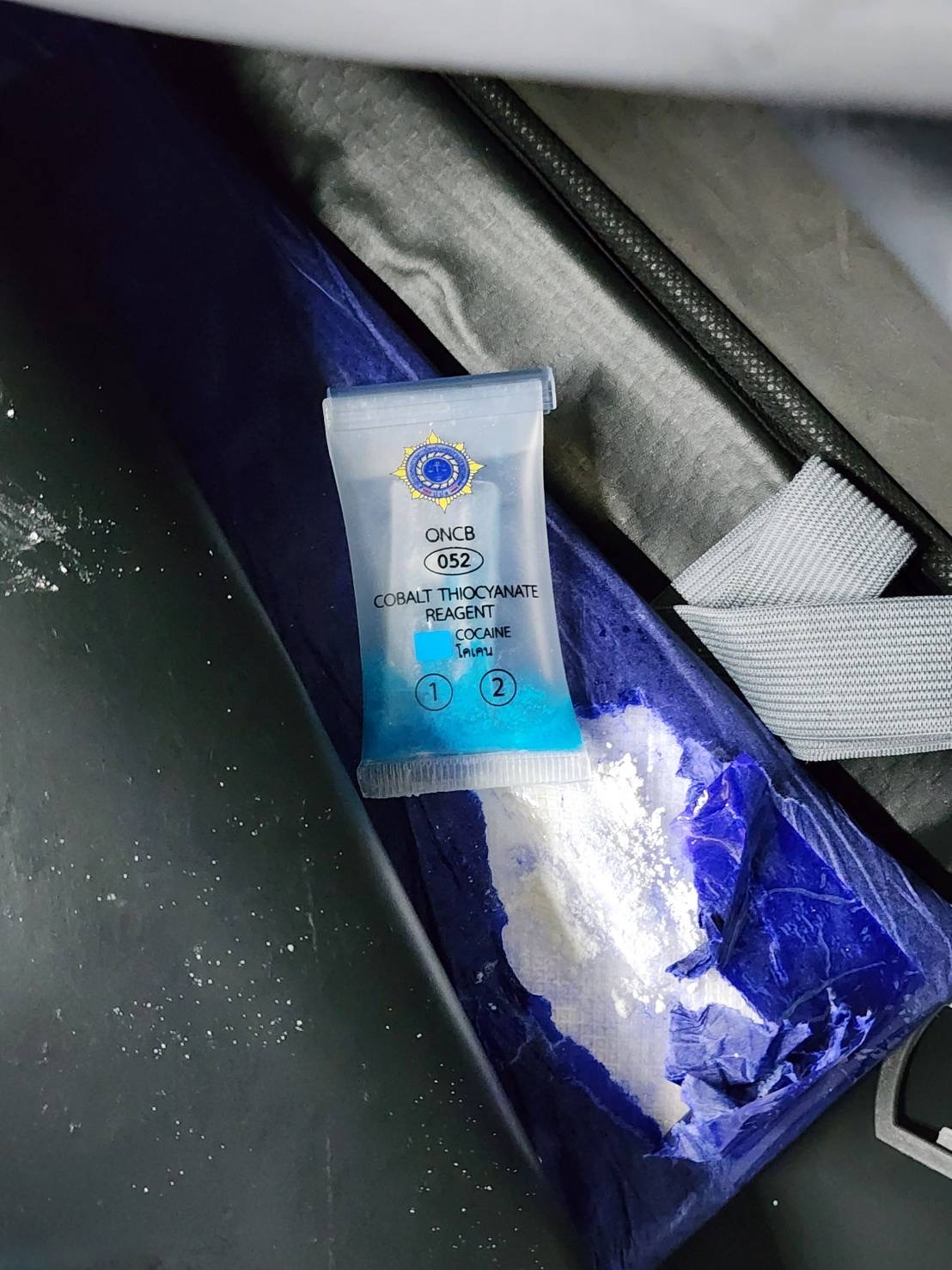 เมื่อนำวัตถุดังกล่าวตรวจสอบเบื้องต้นด้วยน้ำยาเคมี ONCB 052 (Cobalt Thiocyanate Reagent) ปรากฏผลเปลี่ยนเป็นสีฟ้า ยืนยันว่าเป็นยาเสพติดให้โทษประเภท 2 (โคคาอีน) น้ำหนักรวมสิ่งห่อหุ้มประมาณ 3100 กรัม