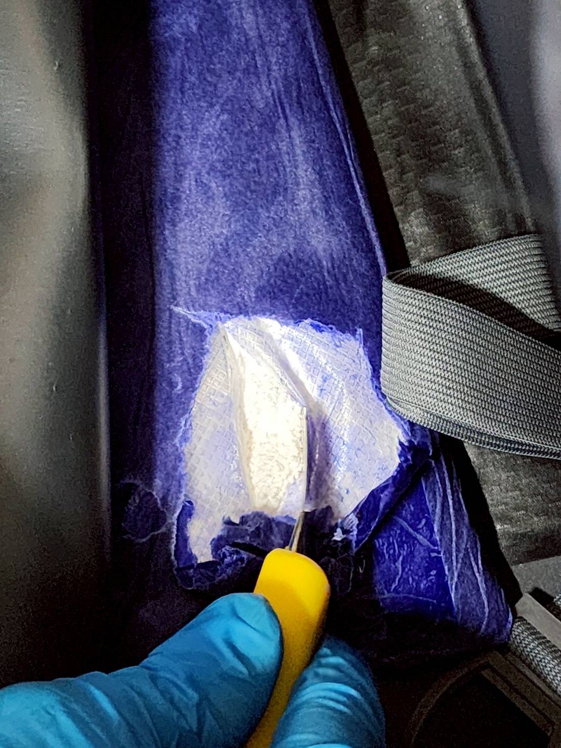 พบความผิดปกติภายในกระเป๋า จากการตรวจค้นอย่างละเอียด พบผงสีขาวซุกซ่อนอยู่ในช่องลับภายในกระเป๋าเดินทาง ห่อหุ้มด้วยกระดาษคาร์บอนสีน้ำเงินเพื่อลดการตรวจจับ