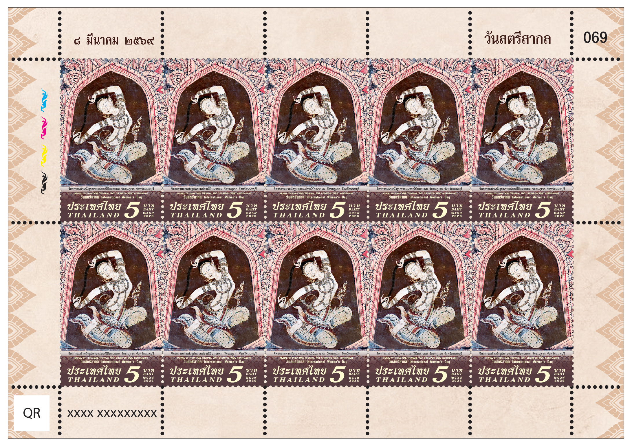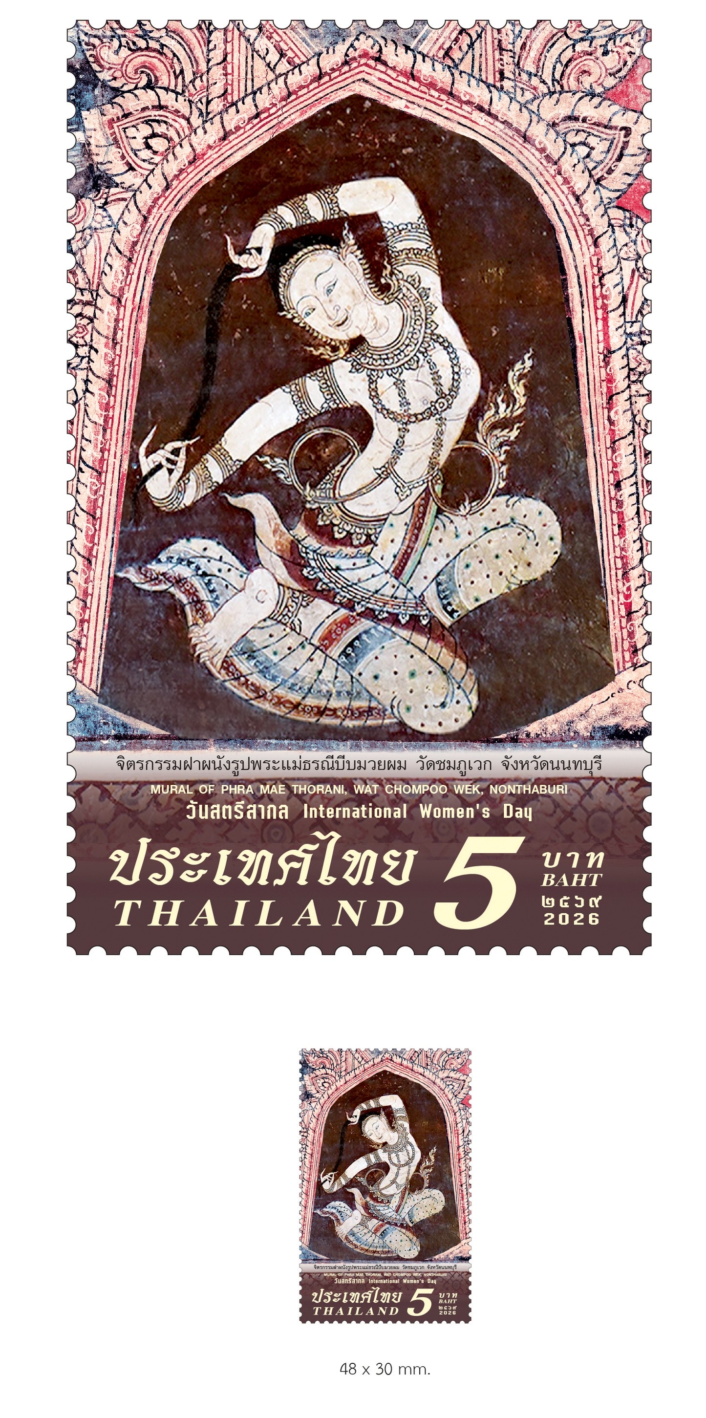 สำหรับแสตมป์ที่ระลึกชุดวันสตรีสากล 2569 ได้นำเสนอภาพ “พระแม่ธรณีบีบมวยผม” จากจิตรกรรมฝาผนังพระอุโบสถ วัดชมภูเวก สื่อถึงพลัง ความมั่นคง และคุณค่าผ่านบทบาทของสตรีผ่านสัญลักษณ์ทางศิลปกรรมไทยอันทรงคุณค่า ภาพพระแม่ธรณีในท่วงท่าบีบมวยผมถือเป็นภาพแทนแห่งความเข้มแข็ง การยืนหยัดในความถูกต้อง และการปกป้องคุณธรรม สะท้อนพลังของผู้หญิงที่มีบทบาทสำคัญทั้งในมิติทางศาสนา วัฒนธรรม และสังคม