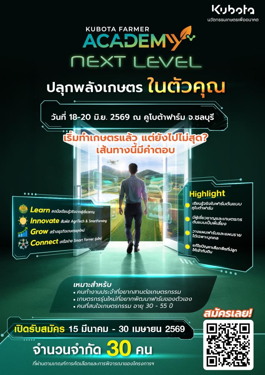 บริษัทสยามคูโบต้าคอร์ปอเรชั่น จำกัด เปิดตัว “KUBOTA Farmer Academy : Next Level” หนุนคนรุ่นใหม่ก้าวสู่เส้นทางเกษตร เสริมความรู้ด้านการทำเกษตรสมัยใหม่ผ่านโครงการพัฒนาศักยภาพเกษตรกรยุคใหม่ ด้วยหลักสูตรที่ผสานเทคโนโลยี AgriTech และแนวคิด Smart Farming เพื่อยกระดับเกษตรกรไทยให้สามารถวางแผนและบริหารจัดการฟาร์มอย่างมีประสิทธิภาพ พร้อมต่อยอดสู่การพัฒนาธุรกิจเกษตร และร่วมขับเคลื่อนภาคเกษตรไทยสู่การเติบโตอย่างยั่งยืนในระยะยาว
