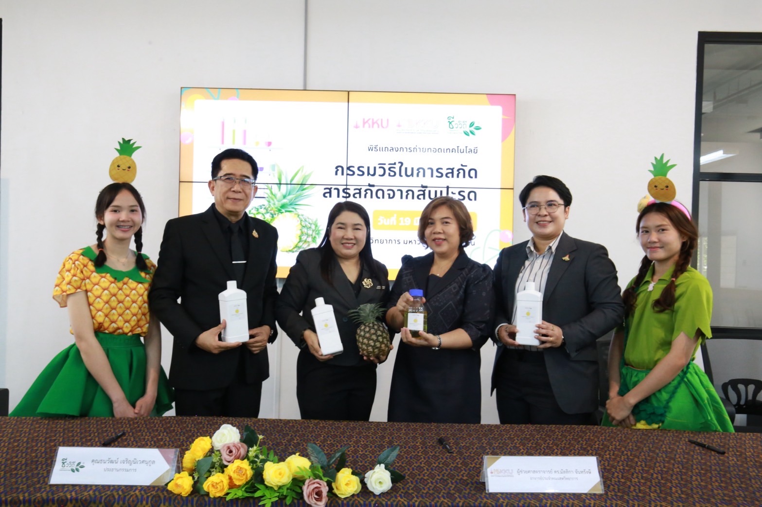 คณะสหวิทยาการ มหาวิทยาลัยขอนแก่น(มข.) จัดพิธีลงนามความร่วมมือถ่ายทอดเทคโนโลยีกรรมวิธีในการสกัดสารสกัดจากสับปะรด ให้แก่บริษัท เซนต์ บิวตี้ คอสเมติก (ประเทศไทย) จำกัด เพื่อยกระดับผลงานวิจัยสู่การใช้ประโยชน์เชิงพาณิชย์ในอุตสาหกรรมเวชสำอาง และเพิ่มมูลค่าให้กับผลผลิตทางการเกษตรในพื้นที่จ.หนองคาย เมื่อวันที่ 19 มี.ค.ที่ผ่านมา