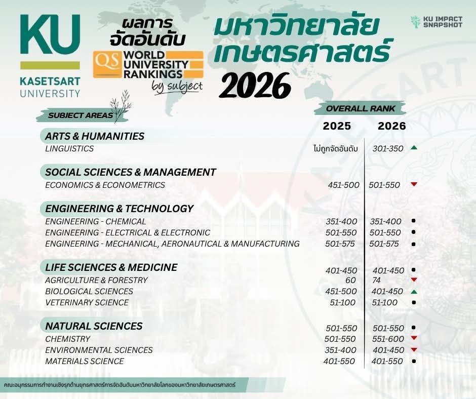ครองอันดับ 1 ของไทย ม.เกษตรฯ ด้าน Agriculture & Forestry จาก QS World University Rankings 2026