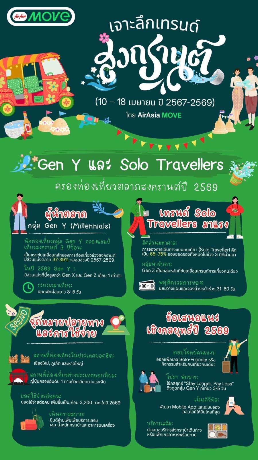 AirAsia MOVE เผยข้อมูลนักท่องเที่ยวช่วง ”สงกรานต์ 3 ปีซ้อน” เจาะลึก Insight คนไทย Gen Y และ Solo Traveller แชมป์เที่ยว กิน-นอนยาวรับปี 2569