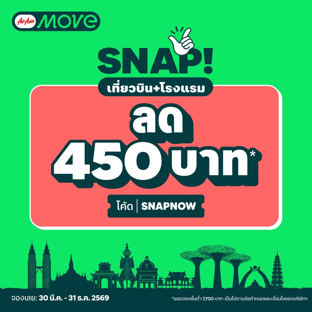 AirAsia MOVE จัดเต็มดีลสุดคุ้มต้อนรับฤดูกาลท่องเที่ยว (High Season) ให้คุณออกไปสำรวจโลกได้ในราคาประหยัดกว่าเดิม ด้วยส่วนลดพิเศษสำหรับจองโรงแรมทั่วโลก ลดเพิ่มทันที 400 บาท เพียงใส่โค้ด MOVEHOTELS50 (เมื่อมียอดจองขั้นต่ำ 3000 บาท) และสำหรับสายเที่ยวแบบแพ็กเกจสุดคุ้มกับ SNAP! (เที่ยวบิน โรงแรม) ทุกจุดหมายปลายทาง รับส่วนลดเพิ่ม 450 บาท เมื่อใส่โค้ด SNAPNOW (เมื่อมียอดจองขั้นต่ำ 7700 บาท) จองเลยวันนี้ที่แอป AirAsia MOVE เพื่อสัมผัสประสบการณ์ ”บิน พัก เที่ยว แอปเดียวครบ” ในราคาสบายกระเป๋า