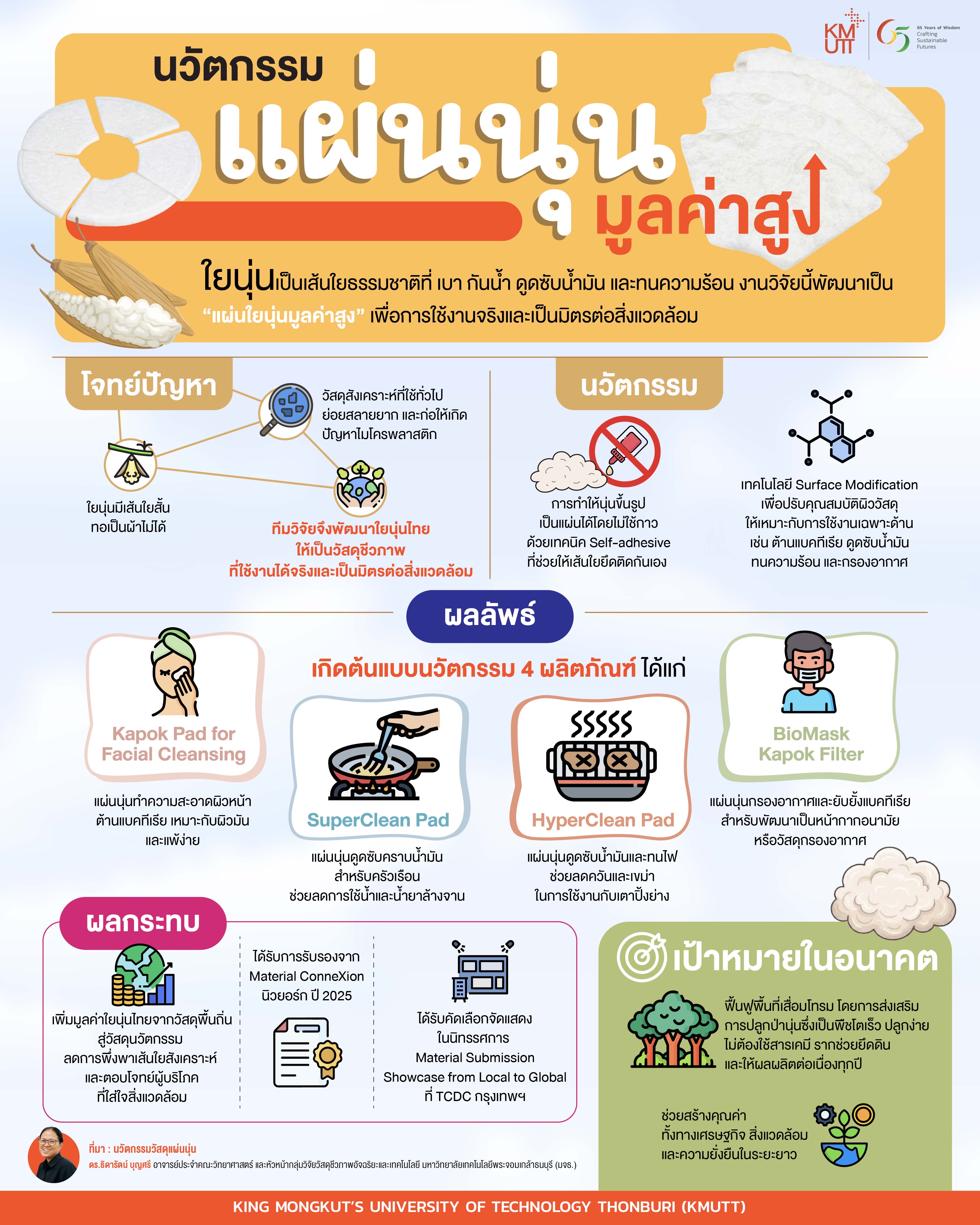 ผลงานนวัตกรรมวัสดุแผ่นนุ่น ประกอบด้วย แผ่นนุ่นทำความสะอาดผิวหน้า (Kapok Pad for Facial Cleansing) แผ่นนุ่นดูดซับคราบน้ำมันสำหรับครัวเรือน (SuperClean Pad) แผ่นนุ่นดูดซับน้ำมันและทนไฟ (HyperClean Pad) และแผ่นหน้ากากนุ่นกรองอากาศและฆ่าเชื้อโรค (BioMask Kapok Filter) ผลงานดังกล่าวเป็นฝีมือนักวิจัยไทย ได้รับการรับรองจากฐานข้อมูล Material ConneXion นิวยอร์ก ปี ค.ศ. 2025 (พ.ศ. 2568) และได้รับการคัดเลือกให้เป็นตัวแทนนวัตกรรมวัสดุไทยสู่เวทีโลก ภายใต้แนวคิด Innovation & Natural Materials ในกลุ่มวัสดุชีวภาพและวัสดุจากธรรมชาติที่ต่อยอดด้วยนวัตกรรม จัดแสดงในนิทรรศการ Material Submission Showcase from Local to Global บริเวณพื้นที่ด้านหน้าของห้อง Material Design & Innovation Center ณ ศูนย์นวัตกรรมด้านวัสดุและการออกแบบ Thailand Creative & Design Center (TCDC) กรุงเทพฯ ระหว่างวันที่ 29 ม.ค. ถึง 30 ธ.ค.นี้ ต่อเนื่อง 1 ปี