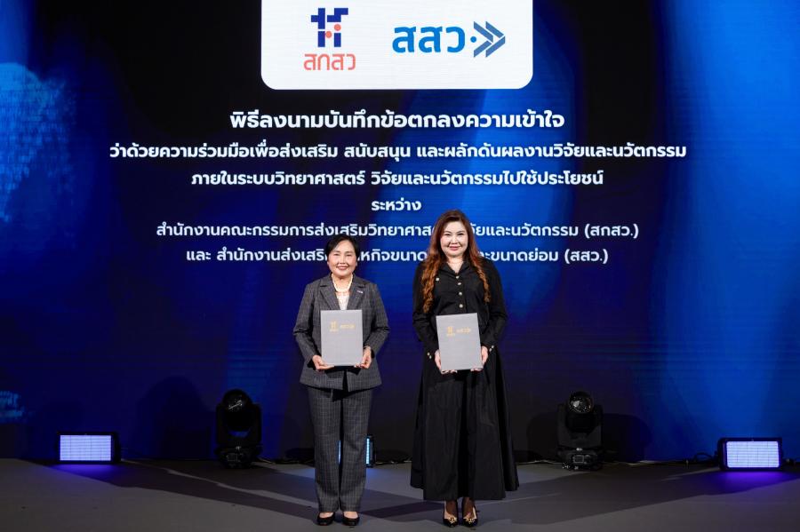 ดร.ปณิตา ชินวัตร รองผู้อำนวยการสำนักงาน รักษาการแทนผู้อำนวยการ สำนักงานส่งเสริมวิสาหกิจขนาดกลางและขนาดย่อม (สสว.) และ ศ.ดร.สมปอง คล้ายหนองสรวง ผู้อำนวยการ สำนักงานคณะกรรมการส่งเสริมวิทยาศาสตร์ วิจัยและนวัตกรรม (สกสว.)ร่วมลงนามบันทึกข้อตกลงความเข้าใจ (MOU) ระหว่าง สสว. กับสกสว. เพื่อส่งเสริมความร่วมมือในการสร้างความเข้มแข็งและผลักดันการใช้ประโยชน์ผลงานวิจัยและนวัตกรรมและส่งเสริมการเติบโตวิสาหกิจขนาดกลางและขนาดย่อม ในงาน Techsauce Healthspan Festival 2026 ที่พารากอน ฮอลล์ ศูนย์การค้าสยามพารากอน เมื่อเร็วๆ นี้
