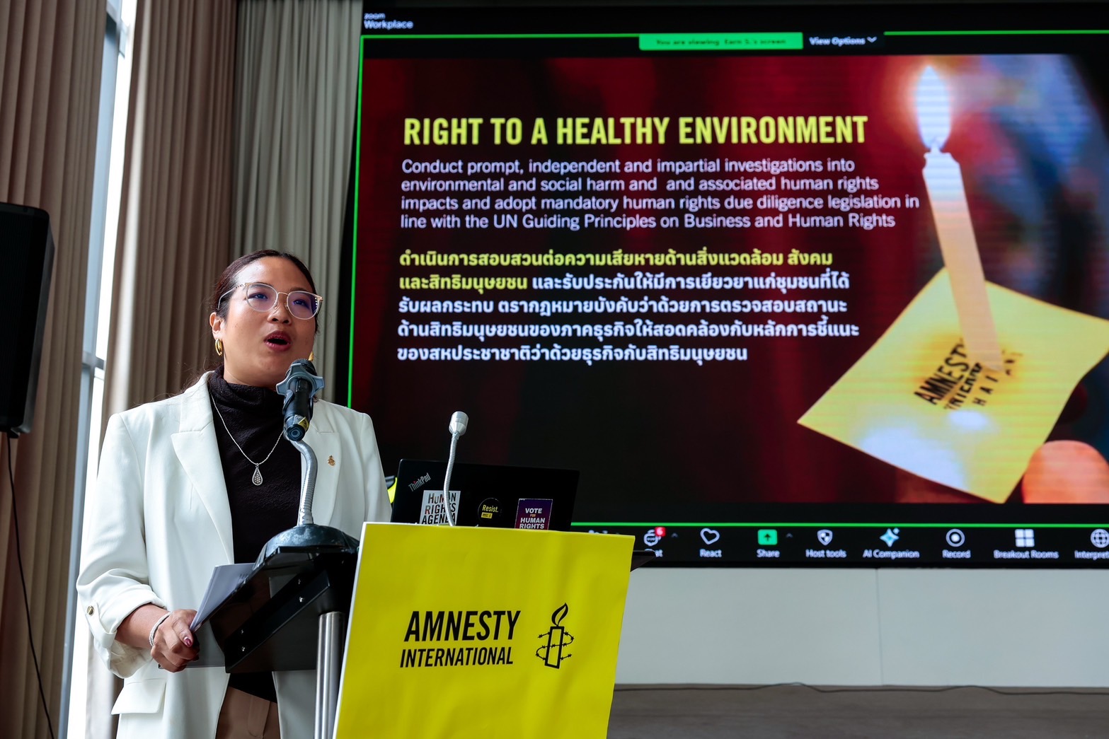 คุณแอกเนส คาลามาร์ด เลขาธิการ แอมเนสตี้ อินเตอร์เนชั่นแนล เผยว่า เรากำลังเผชิญกับช่วงเวลาที่อันตรายและท้าทายที่สุดช่วงหนึ่งของยุคสมัยของเรา มนุษยชาติกำลังตกอยู่ภายใต้การโจมตีจากขบวนการต่อต้านสิทธิข้ามชาติ และรัฐบาลที่มีลักษณะเป็นนักล่า ซึ่งมุ่งแสดงอำนาจนำของตนผ่านการทำสงครามที่มิชอบด้วยกฎหมาย และการบีบบังคับทางเศรษฐกิจอย่างไร้ยางอาย