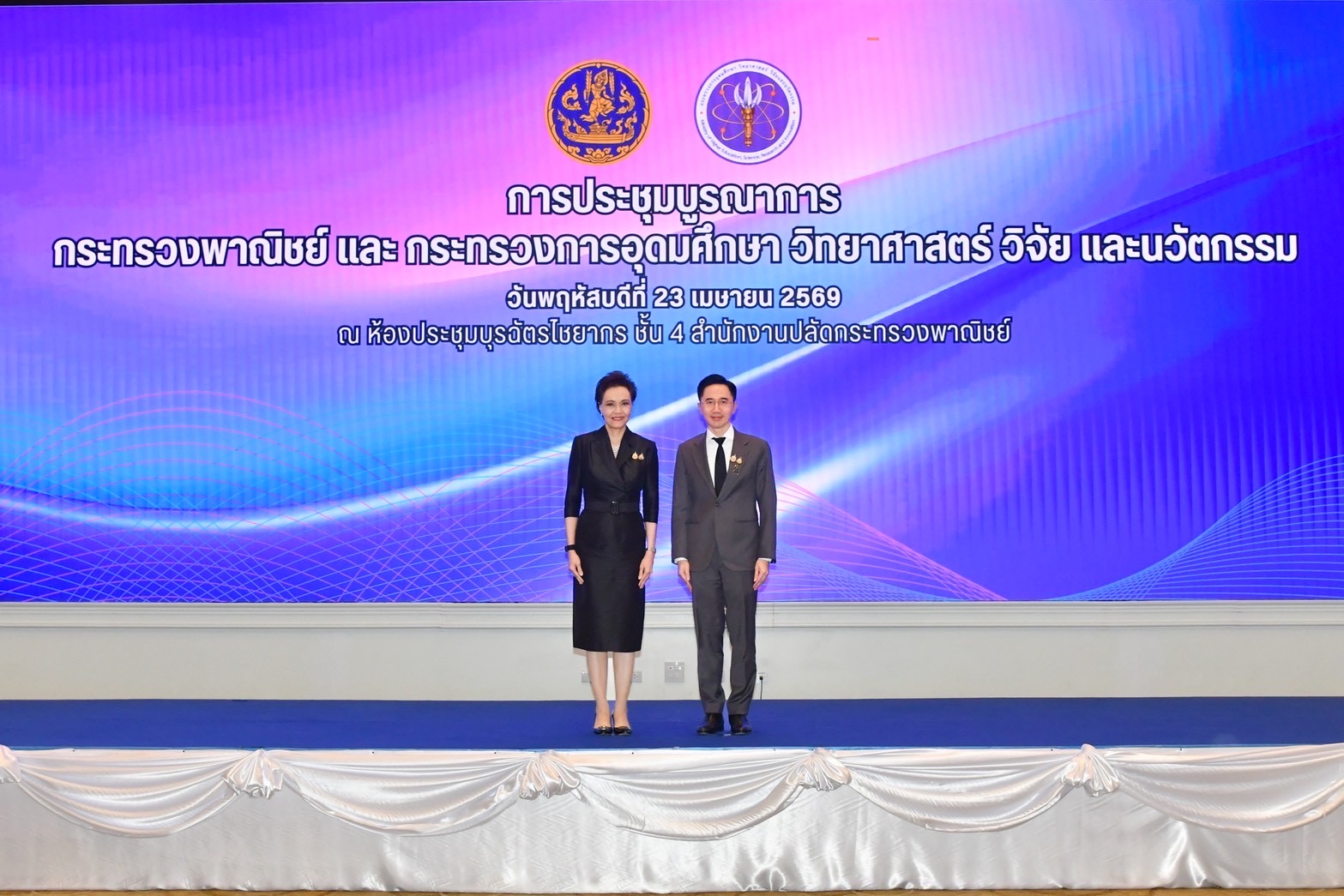 เมื่อวันที่ 23 เม.ย. ศ.ดร.ยศชนัน วงศ์สวัสดิ์ รองนายกรัฐมนตรีและรัฐมนตรีว่าการกระทรวงการอุดมศึกษา วิทยาศาสตร์ วิจัยและนวัตกรรม (อว.) และนางศุภจี สุธรรมพันธุ์ รองนายกรัฐมนตรีและรัฐมนตรีว่าการกระทรวงพาณิชย์ (พณ.) ร่วมประชุมบูรณาการระหว่างกระทรวง อว. และกระทรวง พณ. โดยมี ศ.ดร.ศุภชัย ปทุมนากุล ปลัดกระทรวง อว. นายวุฒิไกร ลีวีระพันธ์ุ” ปลัดกระทรวง พณ. และผู้บริหารจากทั้งสองหน่วยงาน เข้าร่วม เพื่อเชื่อมโยงจุดแข็งด้านงานวิจัยและนวัตกรรมของกระทรวง อว. เข้ากับศักยภาพด้านการตลาดของกระทรวง พณ. มุ่งเป้ายกระดับขีดความสามารถในการแข่งขันของประเทศอย่างเป็นรูปธรรม ที่ห้องประชุมบูรฉัตรไชยากร ชั้น 4 กระทรวงพาณิชย์
