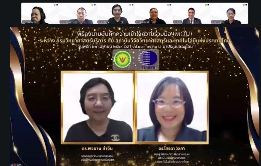 วันที่ 22 เม.ย. กรมวิทยาศาสตร์บริการ (วศ.) กระทรวงการอุดมศึกษา วิทยาศาสตร์ วิจัยและนวัตกรรม (อว.) จัดพิธีลงนามบันทึกความเข้าใจ (MOU) ร่วมกับ สถาบันวิจัยวิทยาศาสตร์และเทคโนโลยีแห่งประเทศไทย (วว.) โดยมี ดร.พจมาน ท่าจีน รองอธิบดี รักษาราชการแทน อธิบดีวศ. และ ดร.โศรดา วัลภา รองผู้ว่าการบริการอุตสาหกรรม ผู้แทน ผู้ว่าการวว. ร่วมลงนาม พร้อมด้วยคณะผู้บริหาร บุคลากรจากทั้งสองฝ่ายร่วมเป็นสักขีพยาน ผ่านระบบออนไลน์ (Zoom) วัตถุประสงค์เพื่อยกระดับการให้บริการทดสอบและสอบเทียบของประเทศให้มีคุณภาพและได้มาตรฐานสากล