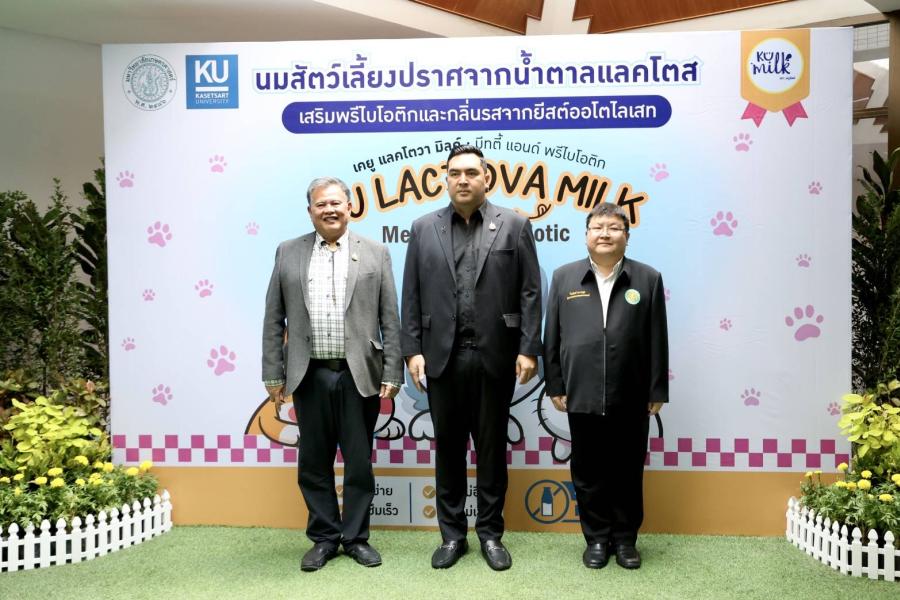 วันที่ 27 เม.ย. นายวัชระพล ขาวขำ รัฐมนตรีช่วยว่าการกระทรวงเกษตรและสหกรณ์ เข้าร่วมงานแถลงข่าวเปิดตัวโครงการโครงการนมสัตว์เลี้ยงปราศจากน้ำตาลแลคโตส เสริมพรีไบโอติก และกลิ่นรสจากยีสต์ออโตไลเสท (KU Lactova Milk) ซึ่งเป็นนวัตกรรมนมสำหรับสัตว์เลี้ยงปราศจากน้ำตาลแลคโตส 100% ผลงานวิจัยและพัฒนาจากศูนย์ผลิตภัณฑ์นม มหาวิทยาลัยเกษตรศาสตร์(มก.) โดยมี ดร.ดำรงค์ ศรีพระราม รักษาการแทนอธิการบดี มก. เป็นประธาน ที่อาคารสารนิเทศ 50 ปี มก. บางเขน กรุงเทพฯ