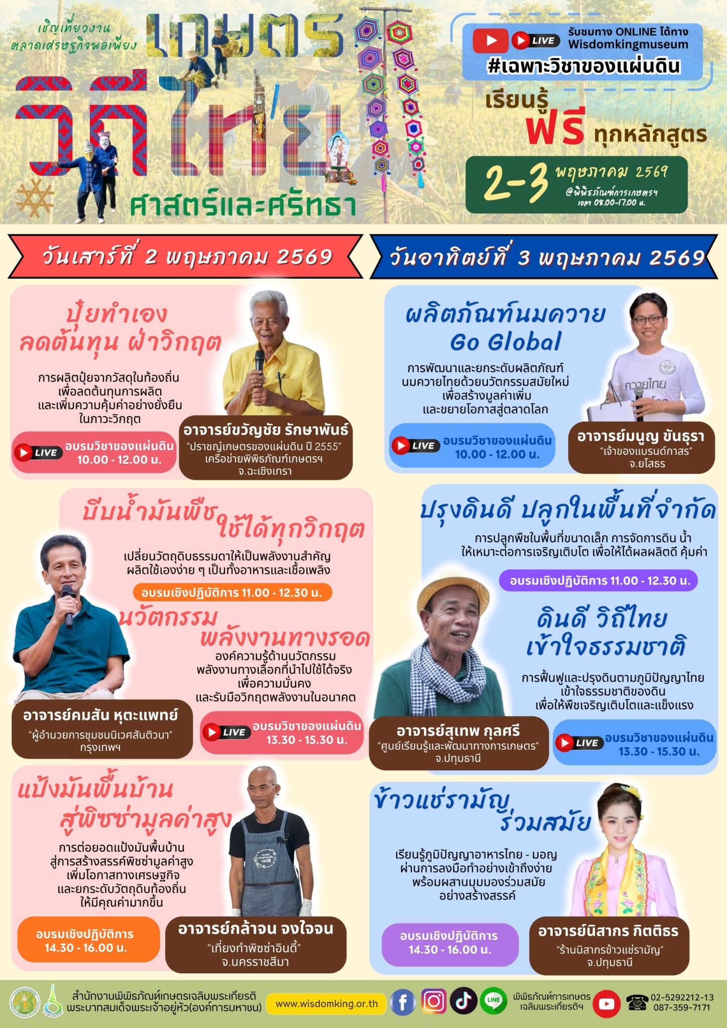 ศาสตร์และศรัทธา” ในวันที่ 2 – 3 พ.ค. ตั้งแต่เวลา 08.00 – 17.00 น. ที่พิพิธภัณฑ์การเกษตรเฉลิมพระเกียรติพระบาทสมเด็จพระเจ้าอยู่หัว จังหวัดปทุมธานี สอบถามรายละเอียดเพิ่มเติมได้ที่โทรศัพท์